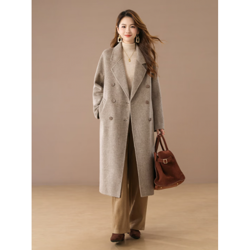 Mocha women's double-faced wool coat with notched lapel, double-breasted, long length, and waist-tie for autumn/winter new collection